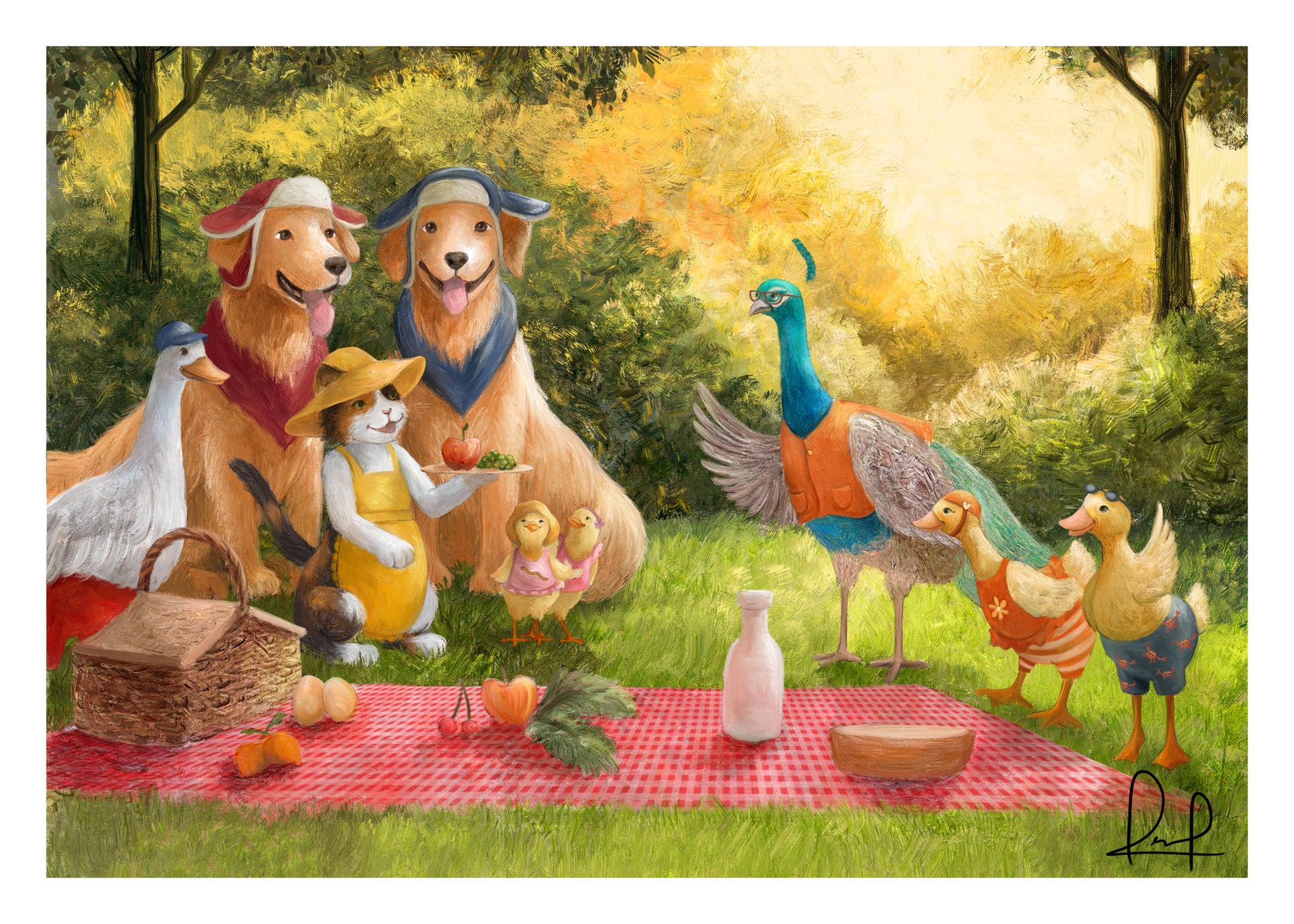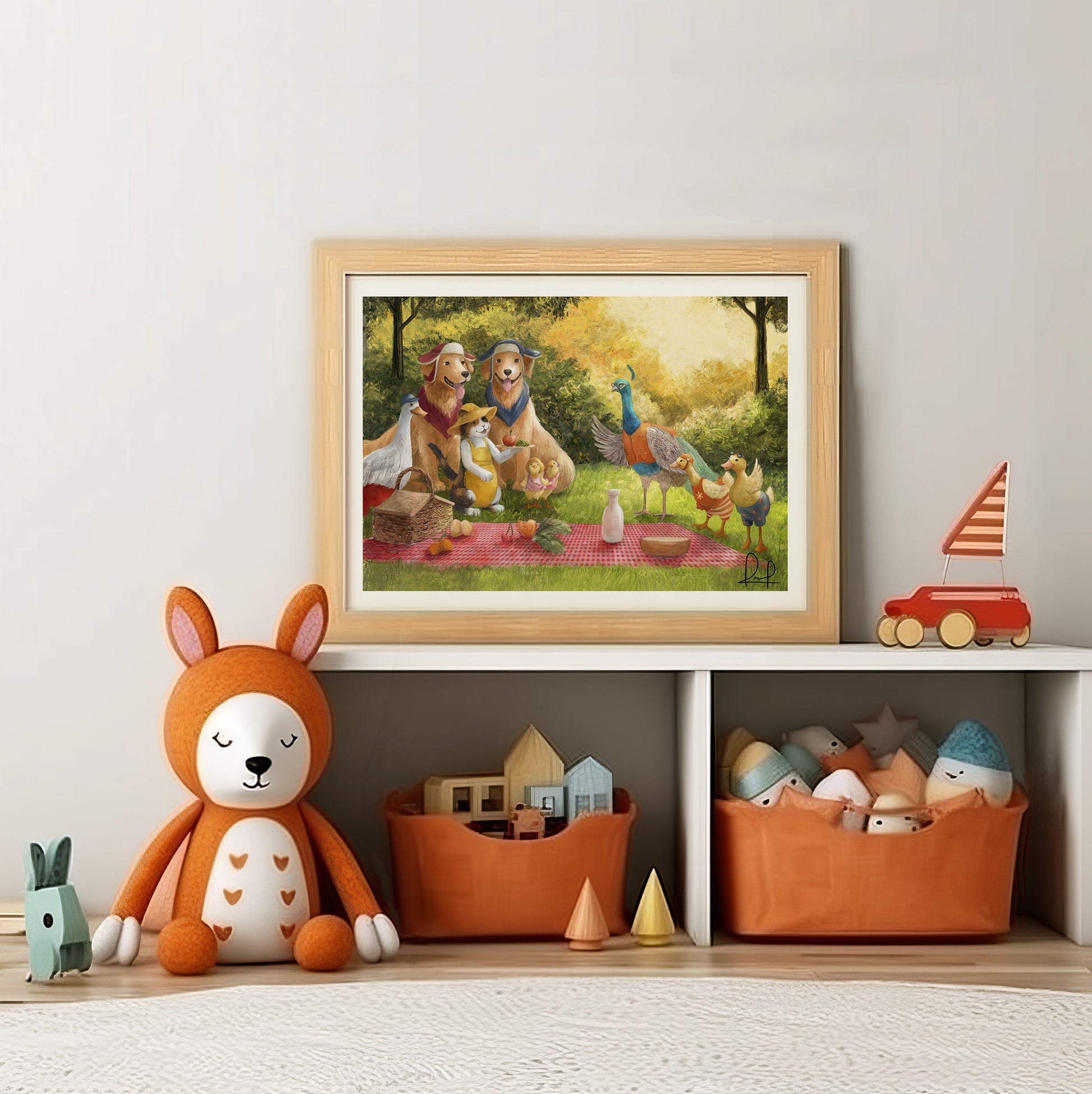 A soft breeze, shared snacks, and good company — it’s a farmyard feast full of laughter and love. This print is from Cooley Farm Adventures by Chantell Cooley. |