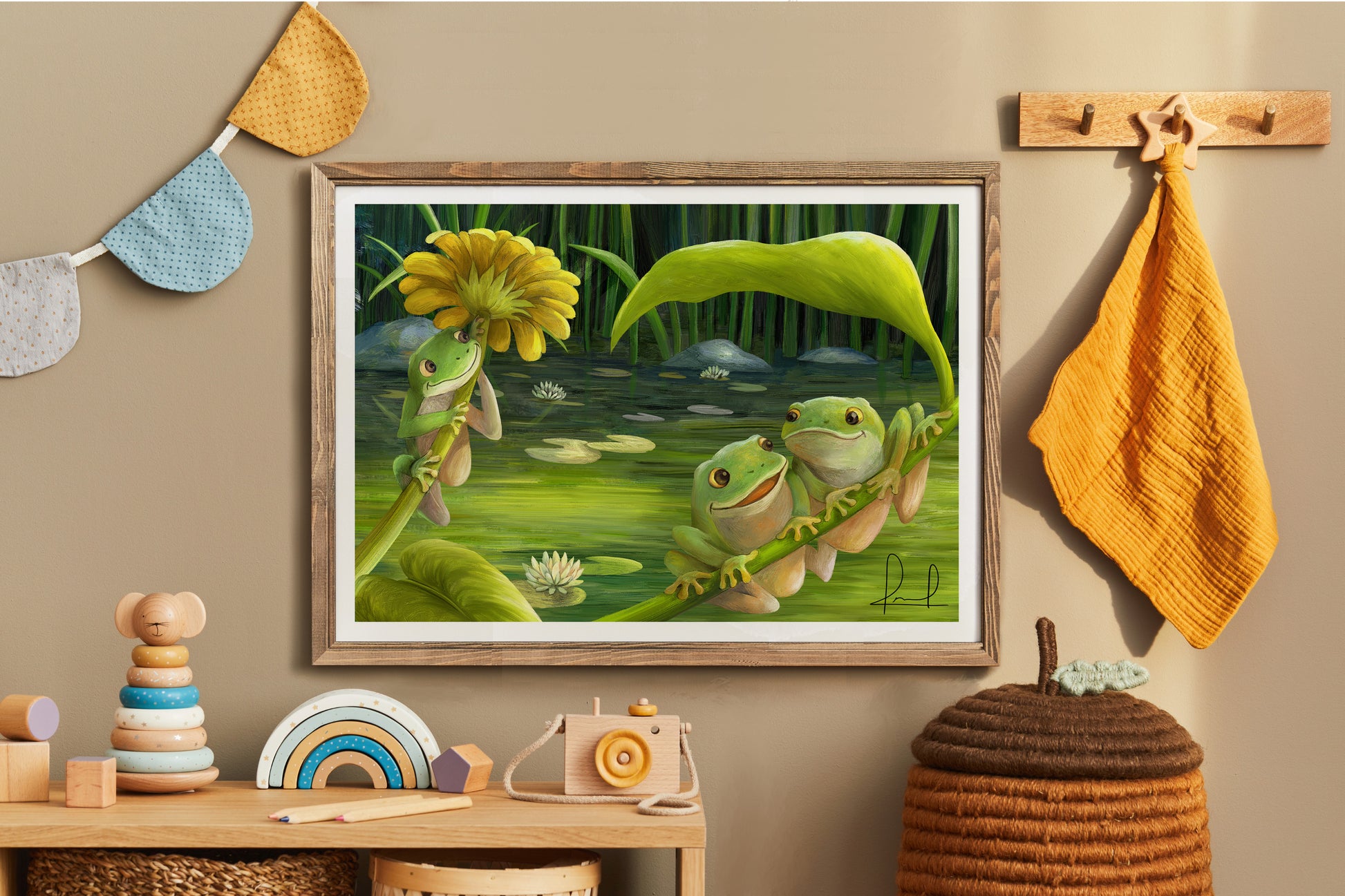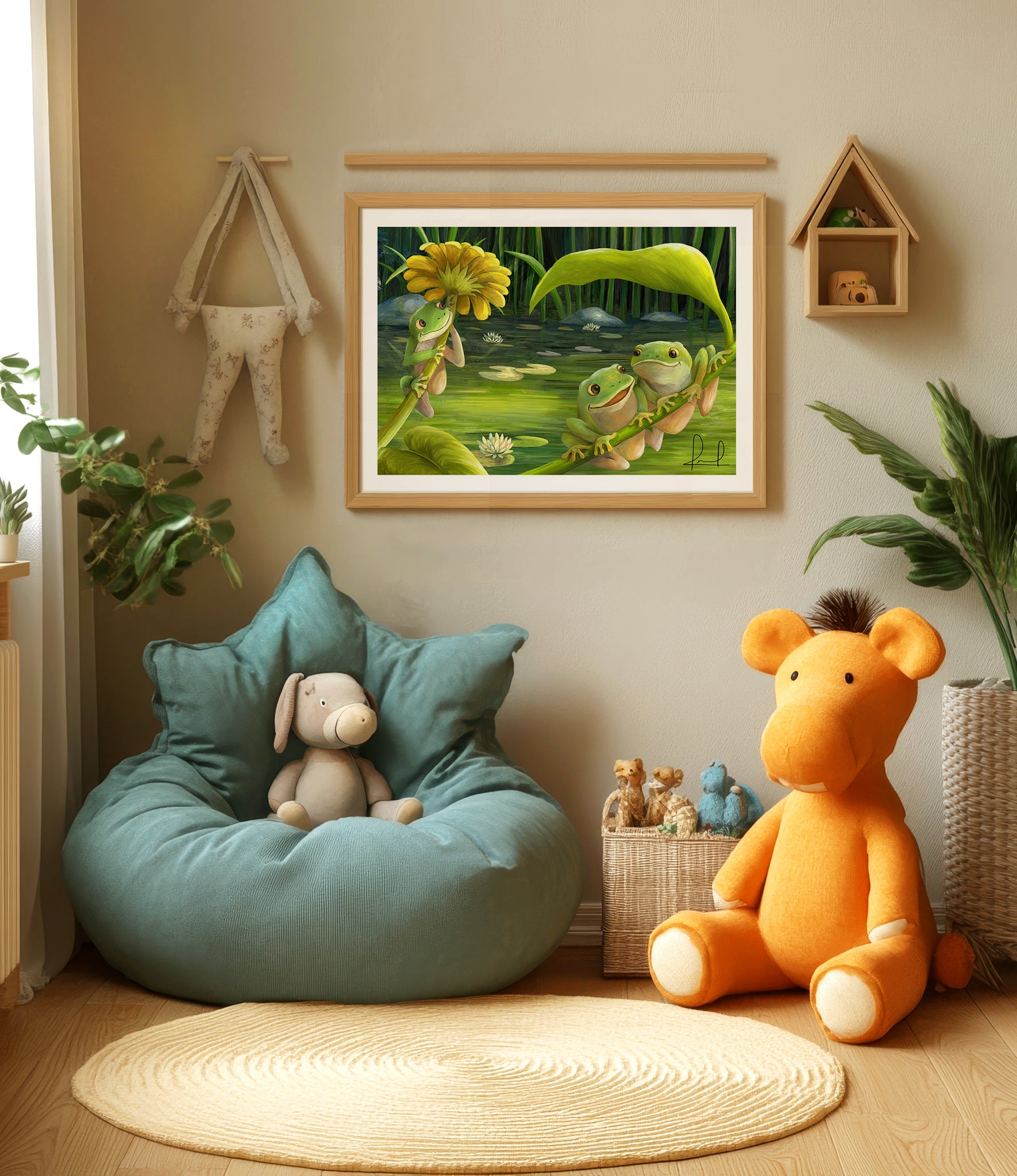 Little frogs leap and lounge among flowers and leaves — because life’s better when you’re with your best friend.