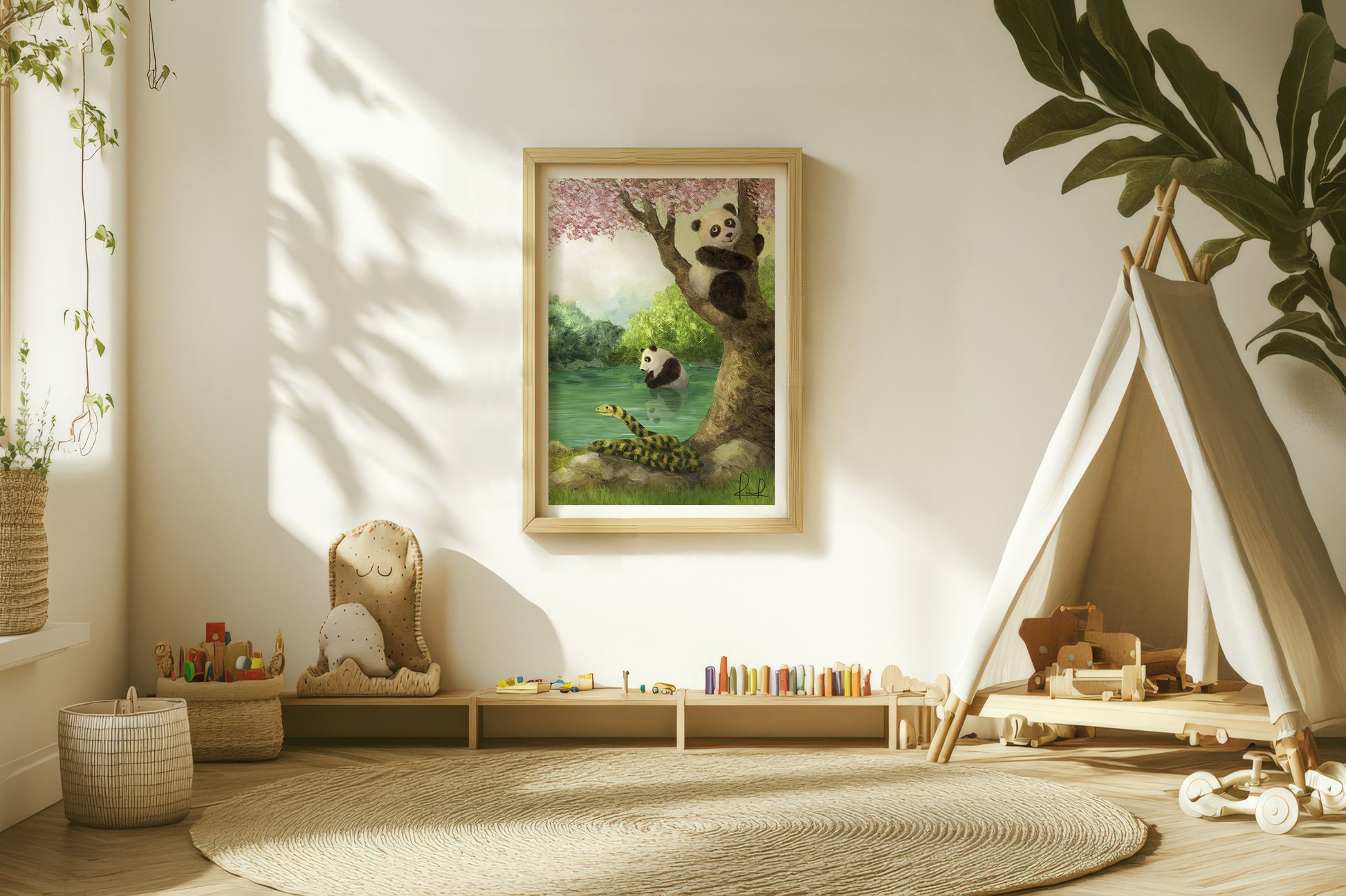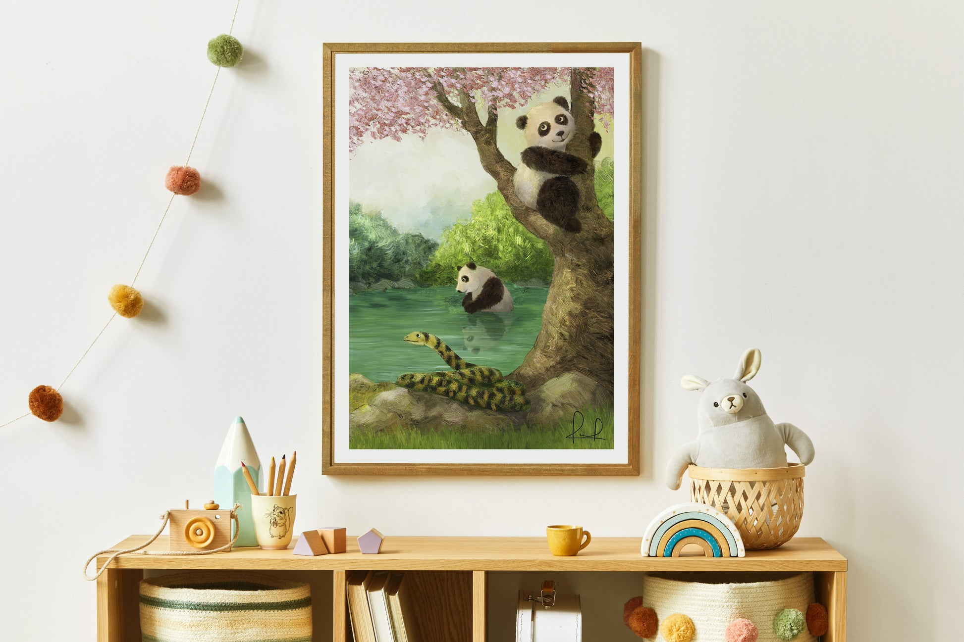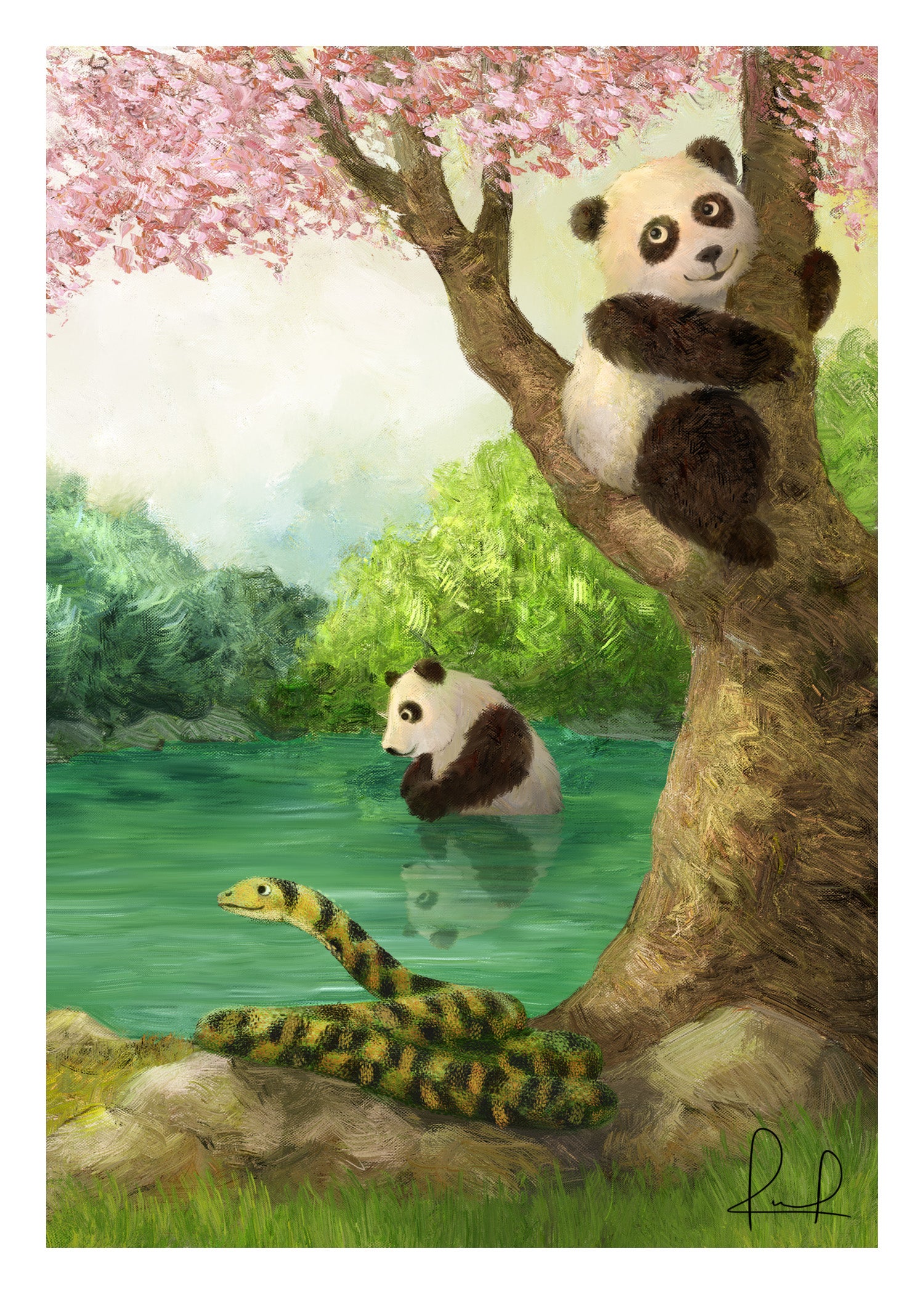 One panda swings from a cherry tree while the other wades into the water below, where something ancient and magical awaits.